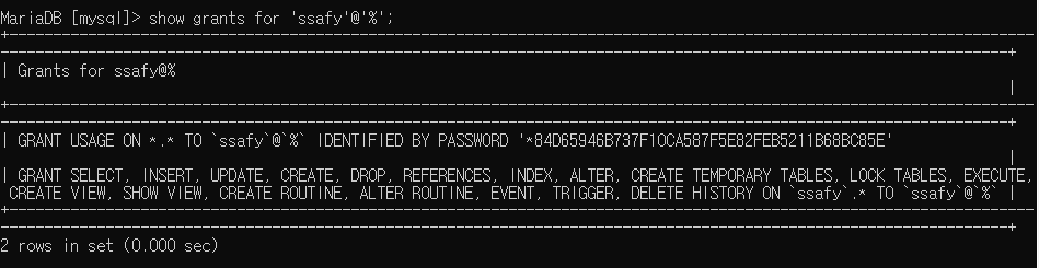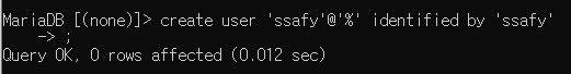 host는 db에 접근하기 위해 이 계정을 사용할 수 있는 호스트 정보를 적어주면 된다. 내 로컬 호스트에서만 사용하고 싶다면 @'localhost', 모든 호스트에서 접근을 허용하려면 @'%'로 적어준다.